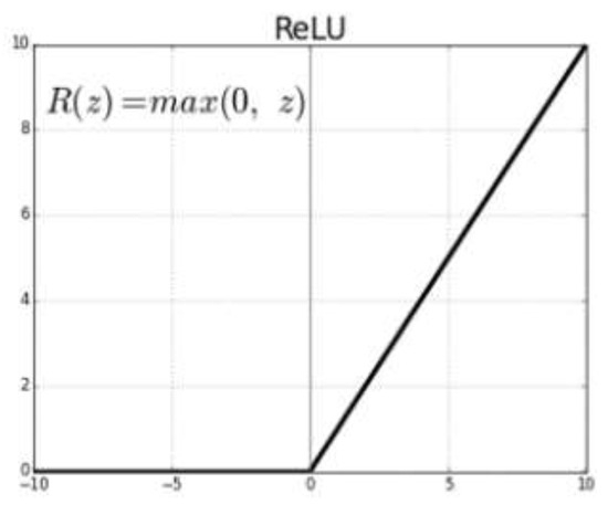 where Yi is the output to the neuron in the current layer;and are the weight and bias of the j-th input on the i-th neuron, respectively; M is the number of inputs; is the j-th output from the previous layer; and f is the activation function, which is in this study, is the most frequently used [16,17], called rectified linear input (ReLU; Figure 1).