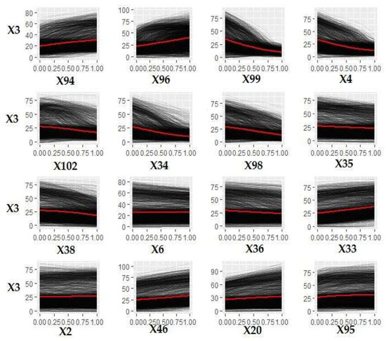 - Identification of factors most influenced each of the three independent variables within each model. To assess which factors most influenced each of the three independent variables within each model, was used the R package “vip” (permutation-based VI scores method) developed in 2018 [44]. The individual conditional expectation (ICE) curves were subsequently constructed to underline the relationship between the most important variables in the models and the output of the model. The ICE curves represent the output values resulting from the model for each value that can be taken from each dataset record (gray lines) [45]. The red lines of each figures represent average output values as the value of each variable changes. Individual conditional expectation (ICE) plots, is a tool for visualizing the model estimated by any supervised learning algorithm developed in 2015 [45]. From the variation in this red line, we determined the range of increase or decrease in the average output to increase of the unit of measure of each variable. In this calculation, the highest error of each model between RMSE and MAE was considered, using following equations:Maximum range value:Max(X0 ± (Max(RMSE: MAE))) − (X1 ± (Max(RMSE: MAE)))/|Y0 − Y1|Mean range value:Minimum range value:where X0 is the output value at v normalized input value of 0, X1 is the output value at a normalized input value of 1, Y0 is the non-normalized input value = 0, and Y1 is the non-normalized input value = 1.Min(X0 ± (Max(RMSE: MAE))) − (X1 ± (Max(RMSE: MAE)))/|Y0 − Y1|