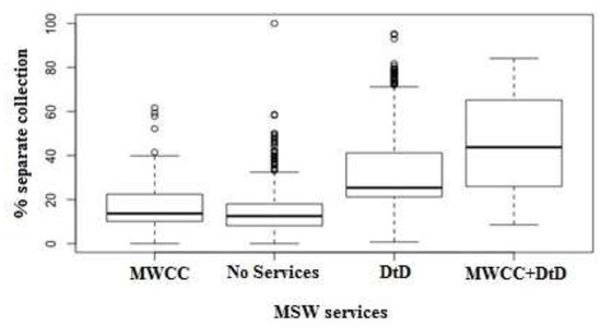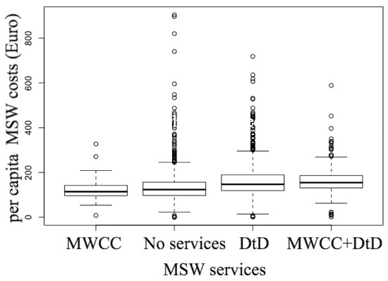The distribution of these costs was not normal. (Shapiro–Wilk W-test = 0.78685, p-value < 0.0001). The nonparametric Kruskal–Wallis test was used, highlighting a difference between groups (Kruskal–Wallis chi-squared = 194.36, df = 3, p-value < 0.0001). Dunn’s post-hoc test subsequently highlighted no statistically significant difference between per capita costs of municipalities with a municipal waste collection center (MWCC) and without any service (p = 0.089) but costs were higher in municipalities with both door-to-door service and a municipal waste collection center (MWCC+DtD) compared to the municipalities with only a municipal waste collection center (MWCC) or to the municipalities with neither of two services (both p < 0.0001), and between those who have both door-to-door service and a municipal waste collection center (MWCC+DtD) and the municipalities with only door-to-door service (DtD) (p = 0.0057) (Figure 13).
