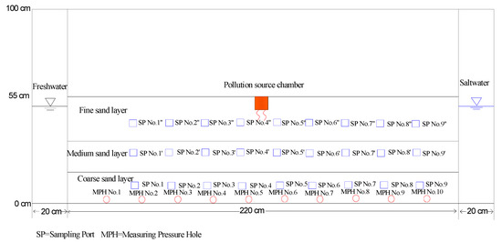 There were ten pressure taps arranging at the bottom of the sand tank, which were used to measure the groundwater level variation in the aquifer. The distance between each two pressure taps was 20 cm. The pressure tap was connected with a transparent PU pipe, which was connected with an acrylic transparent glass pipe on the pressure plate. A 0.2 mm filter screen was arranged at the pressure tap to prevent the sand particles from flowing into the PU pipe and blocking the pipe. A ruler was installed on the pressure plate to record the groundwater head in the sand tank at different times during the experiment. The sampling ports were placed on the back of the sand tank, and there were nine sampling ports in each layer. The interval between each two sampling ports was 20 cm. More details about the experiment device can be found in Guo et al. [56].