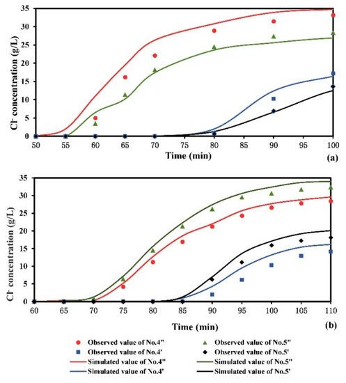 Figure 2. Comparison of simulated and observed Cl concentrations over time at selected observation points (No. 4′, No. 5′, No. 4′′ and No. 5′′) for (a) scenario 1 and (b) scenario 2.