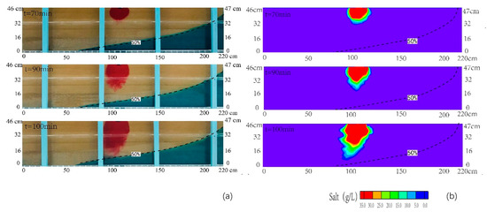 Figure 5a,b illustrated the observed and simulated plume movement at various times for scenario 2. The results showed that the simulated motion of seawater-contamination plume matched the observed one well. The observed length of the 50% isoline of the seawater wedge was 110 cm, which was smaller than that of scenario 1. It was because that the head at inland boundary was higher than the seawater level, and hydraulic gradient slope was inclined to the sea. It reflected that the large quantity of inland recharge had a negative impact on the seawater intrusion process in the layered aquifer, which was of great significance to the prevention and controlling of seawater intrusion in coastal areas [5]. From Figure 5, one can see that the plume migrated in the upper layer and the shape of it was semi-elliptic during the period of 60 and 80 min. The concentration of the plume was highest in the infiltration area, and it decreased gradually on both sides. Similar to scenario 1, the plume became concave at the interface of the upper layer and middle layer. Then, the plume moved downward in the medium sand layer at the time between 80 and 95 min. There was a narrow transition region at the edge of the pollution plume, which indicated that the concentration of plume decreased gradually in the process of migration. It was consistent with the observation by Sun et al., (2019). Subsequently, the plume moved into the bottom layer. The front of the simulated plume migrated with flow towards the sea boundary at the time of 110 min, which was consistent with that of the laboratory experiment. There was no preferential flow in the numerical simulation due to the homogeneity of the sand layers, which was different from that of the experiment.