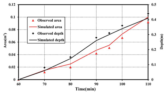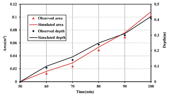 Figure 6 presented the observed and simulated seawater contamination plume area and maximum vertical pollution depth over time for scenario 2. The simulated plume area and maximum vertical pollution depth were slightly larger than the observed values, which was similar to scenario 1. The area of plume and maximum vertical pollution depth increased slowly with time in the upper layer. The area of plume increased by 0.02 m2 for a 0.16 m increase in the maximum vertical pollution depth. Then, the area of plume and the maximum vertical pollution depth began to increase rapidly with respect to time, due to the higher velocity in the medium sand layer. The area of plume increased by 0.03 m2 for a 0.16 m increase in the depth, which indicated that the variation rate of area increased in the medium sand layer compared to that of the fine sand layer. When the plume migrated into the coarse sand layer, the area of plume and the maximum vertical pollution depth increased more rapidly with respect to time in the medium sand layer. The variation rate of area in the coarse sand layer reached 1.4 times of that in the medium sand layer. At the time of 110 min, the area of plume increased to 0.09 m2, which was slightly smaller than that of scenario 1. It demonstrated that the inland recharge diluted the concentration of contamination plume.