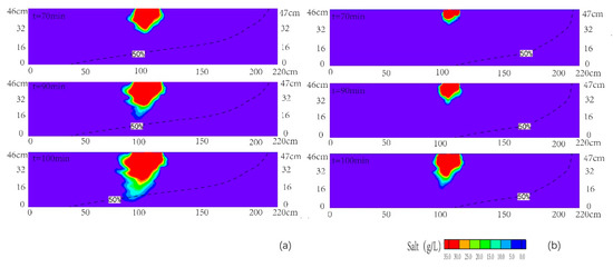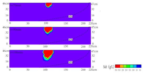 Finally, the sensitivity of the plume transport to the concentration of contamination was analyzed. The saltwater concentration was reduced from 35 g/L to 15 g/L in the new model. Figure 9 showed that the fitting to the observed plume was worse, compared with that of basic scenario in Figure 3b. One can see that the area of pollutant plume and maximum vertical pollution depth decreased sharply, whereas the movement of the plume decreased slightly in the horizontal direction of the new model, compared with the simulated ones in scenario 1. It was because the dispersion was too small. At the time of 100 min, the simulated area of plume was 0.07 m2, which was smaller than that of basic Scenario. However, the direction of pollutant plume migration was downstream and landward in the aquifer. Therefore, the range of plume was sensitivity to the concentration of contamination.