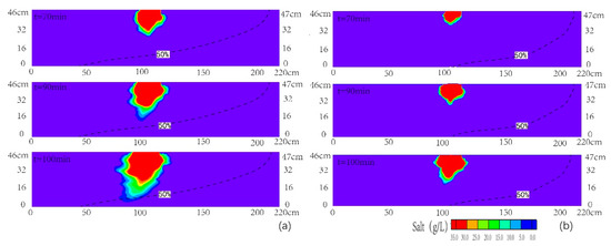 Figure 3a,b presented the comparison between the transient observed and simulated contours of the contaminant of salinity at various times after the injection (the time of 50 min) for scenario 1. The simulated results have a good correlation with the observed data from laboratory tests. It indicated that the simulated results were reliable. When the invasion of seawater reaches the equilibrium status, the horizontal length of the 50% isoline of the observed seawater wedge can reach 145 cm. Figure 3 reported that the plume mainly moved downward at different time. The freshwater and contaminant moved along the interface of the seawater wedge, which were influenced by the vertical velocity coupled with horizontal velocity from sea to inland. The salinity concentration reached the highest value around the infiltration area. The transition area at the edge of pollution plume was very narrow. During the time between 50 and 70 min, the plume moved downward and laterally, and the semi-elliptical shape was formed in the upper layer. Due to the higher velocity formed directly below the interface between upper layer and middle layer, the pollution plume became concave at the interface. Then, the plume moved downward in the medium sand layer during the time ranging from 70 to 90 min. At the time of 90 min, the plume began to migrate into the coarse sand layer. The pollution plume became concave at the interface of middle layer and bottom layer. At the time of 100 min, the simulated result showed that the plume migrated downward and landward with the water flowing in the coarse sand layer, which was consistent with the observed one in the laboratory. When the salinity pollution plume approached the saltwater interface, the front of it was more diffuse. It was in line with the study of Zhang et al. (2002). Finally, the observed seawater-contamination plume intersected with the seawater wedge at the time of 100 min.