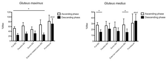 - Contreras, B.; Vigotsky, A.D.; Schoenfeld, B.J.; Beardsley, C.; Cronin, J. A comparison of gluteus maximus, biceps femoris, and vastus lateralis electromyography amplitude for the barbell, band, and American hip thrust variations. J. Appl. Biomech. 2016, 32, 254–260. [Google Scholar] [CrossRef] [PubMed]
