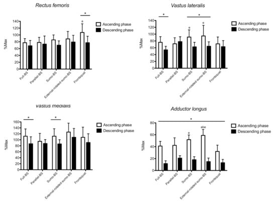 - Paoli, A.; Marcolin, G.; Petrone, N. The effect of stance width on the electromyograhycal activity of eight superficial thigh muscles during back squat with different bar loads. J. Strength Cond. Res. 2009, 23, 246–250. [Google Scholar] [CrossRef] [PubMed]