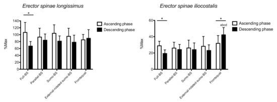 - Clark, D.R.; Lambert, M.I.; Hunter, A.M. Muscle activation in the loaded free barbell squat: A brief review. J. Strength Cond. Res. 2012, 26, 1169–1178. [Google Scholar] [CrossRef]