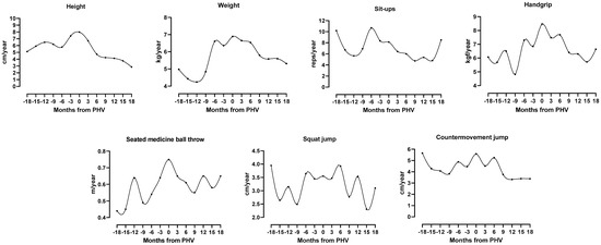 For seated medicine ball throw, the velocity rose from 0.44 m·year−1 at 18 months before-PHV to 0.64 m·year−1 at 12 months before-PHV but declined right after to 0.49 m·year−1 at 9 months before-PHV. It then accelerated reaching a peak (0.75 m·year−1) coincident with PHV. Subsequently, the velocity decreased to 0.55 m·year−1 at 9 months after-PHV and fluctuated until 0.65 m·year−1 at 18 months after-PHV.