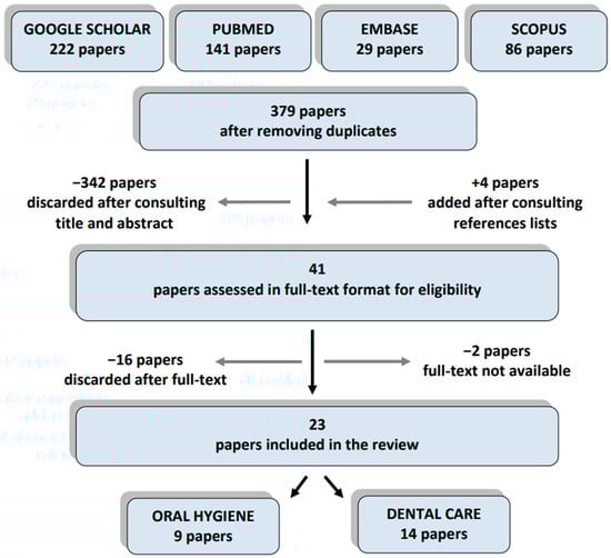 Therefore, forty-one papers were assessed; eighteen papers were discarded (Table S3). Twenty-three studies were finally included in this systematic review: nine studies concerned tooth brushing and oral hygiene skills in children with ASDs and 14 studies concerned their cooperation during dental procedures (Figure 1) [,,,,,,,,,,,,,,,,,,,,,,]. The majority of the papers included (21 studies) were published in the last decade, with 10 papers published from 2018 to 2020 [,,,,,,,,,] (Table 1).