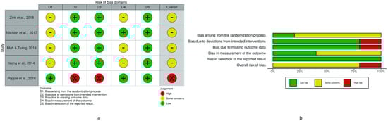 Regarding the five RCTs (Figure 2), four were judged at a moderate risk of bias [,,,] and one at a high risk of bias []; among the 18 non-randomized studies (Table 4), one was judged at a low risk of bias [], 16 were at a moderate risk of bias [,,,,,,,,,,,,,,,], and one was at a serious risk of bias [].