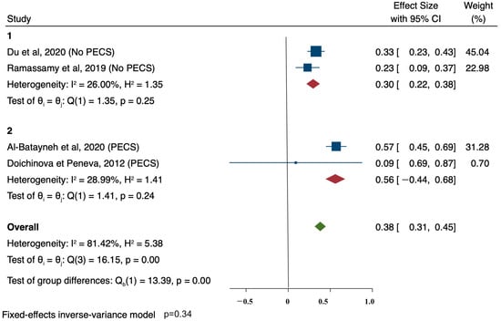 The effect size was calculated within each group and across all studies using an inverse-variance model. Sub-group heterogeneity was moderate both in PECS (I2 = 28.99%) and non-PECS (I2 = 26.00%), while overall heterogeneity was high (I2 = 81.32%). Both PECS and non-PECS aids were effective in PI improvements, but no differences were found between the two sub-groups (p = 0.34).