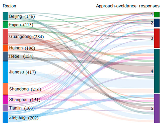 The regional distribution of samples and the regional contribution to each level of AAR are two important points for the sample’s characterization. In order to present these data in an efficient way, we adopted the Sankey diagram in Figure 1. The width of the curve is proportional to the regional contribution to each level, hence the most important contributions are readily located by comparing the width of curves. The left side of this diagram showed the regional distribution of the respondents: 146 respondents in Beijing, 113 respondents in Fujian, 284 respondents in Guangdong, 106 respondents in Hainan, 154 respondents in Hebei, 417 respondents in Jiangsu, 216 respondents in Shandong, 151 respondents in Shanghai, 103 respondents in Tianjin, and 202 respondents in Zhejiang. The right side of Figure 1 demonstrated that a large proportion of the respondents in eastern China were willing to accept the PCT scheme, because node “4” showed the maximum width, closely followed by node “5”. Through tracing the curves of node “5”, it could be found that respondents from Jiangsu province hold the most positive response to PCT scheme, and the second most positive is Zhejiang province.