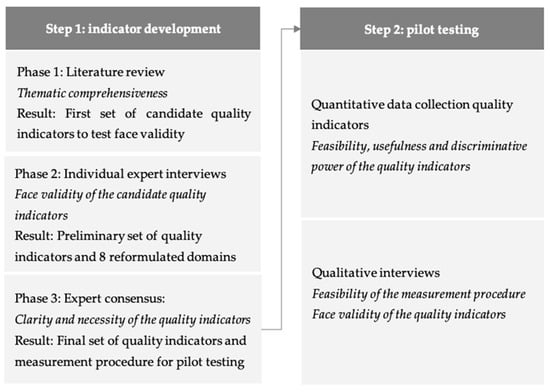 We used a two-step approach with a mixed-method design based on a standardized indicator testing protocol for generic quality indicators in order to develop the quality indicator set and measurement procedure [29,35]. First, we developed the set of quality indicators using the Rand/UCLA appropriateness method in three phases: (1) literature review to develop a preliminary set of quality indicators, (2) interviews with experts to test face validity of the preliminary set of quality indicators, and (3) indicator selection by expert evaluation [36]. Second, we evaluated the face validity, feasibility, discriminative power, and usefulness of the quality indicators in a quantitative cross-sectional application of the quality indicators in combination with qualitative interviews. Figure 1 shows an overview of the development process and pilot testing.