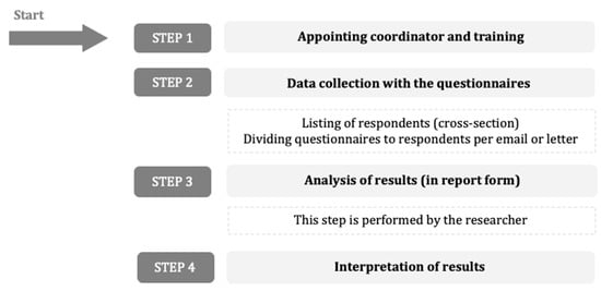 All nursing homes followed the same measurement procedure based on a previously developed and tested method in order to measure the quality indicators via questionnaires [16]. Before the start of the pilot test, a coordinator per nursing home was appointed in consultation with the researchers. The researchers visited the coordinator (in the nursing homes) in order to explain the study, expectations, measurement procedure, how to work with the online questionnaires, going through the detailed instruction manual. The coordinator responsibilities include the supervision of the measurement procedure, communication within the nursing home (e.g., informing the staff about the instrument and procedure, announcing start date), drafting the list for including residents (in concordance with the researcher), and distribution of the questionnaire among residents, family caregivers and staff (Figure 2). The coordinator was also asked to keep a diary and note thoughts regarding the workload, setbacks, and/or other findings (Figure 2).