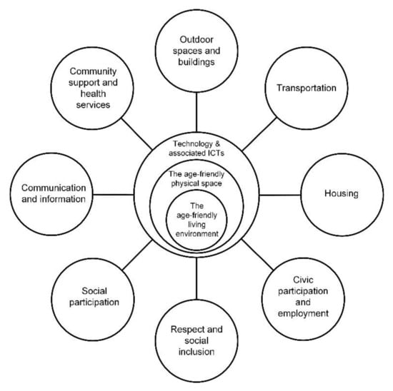 However, as noted extensively by Marston and van Hoof in 2019 [48], 13 years after the original framework was published, there has not been any additional iterations coinciding with societal changes such as technology use, deployment, and implementation. This is where the proposed extension—the Smart Age-friendly Ecosystem (SAfE) framework—was created and introduced [48]. Figure 2 illustrates the new framework acknowledging the physical space, technology, and associated ICTs (information communication technology) as described by Marston and van Hoof [48].