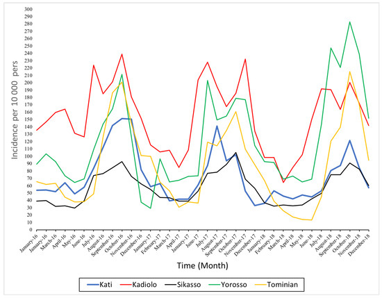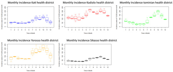 The health districts of Kadiolo, Yorosso, and Tominian had the highest average monthly aggregate incidence, which ranged from 160 to 290 cases per 10,000 persons per month. The lowest incidences were observed in the health districts of Sikasso and Kati (Figure 1).