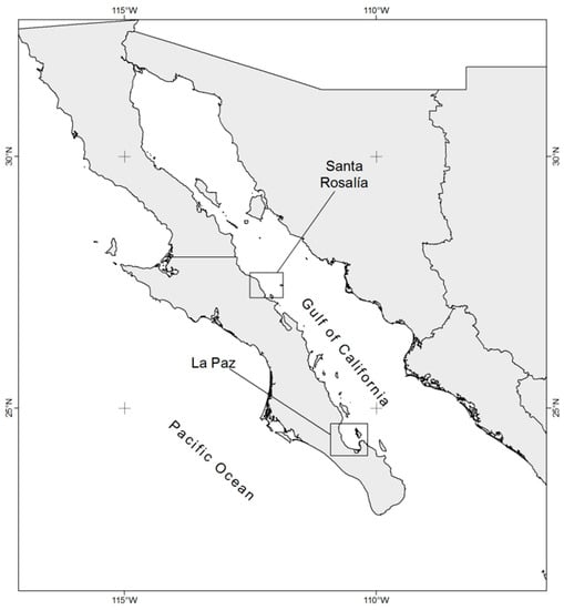 Deposits of various minerals are located in the Gulf of California, some of which have been exploited through mining operations at sites adjacent to the coast [10]. Two mining sites of particular interest because of nearby human settlements and coastal fishery activities are Santa Rosalía (STR), at the central part of the gulf, and Bahía de La Paz (LAP), near the tip of the Baja California Peninsula, both located on the west coast of the Gulf of California, México (Figure 1). In STR, copper extraction operations were carried out since the second half of the 19th century to the late 20th century [11]. Tons of wastes from these mining operations were deposited over the years on the beach and directly into the marine environment. The copper content on the beaches of STR (up to 30,380 µg g−1) is higher than levels recorded in industrialized areas of Russia [12]. Iron and zinc deposits are also found in this zone [10], and high lead concentrations (up to 2100 µg g−1) have been found in sediments [12]. The second case addressed here regards the current phosphorite extraction operations in San Juan de la Costa, inside LAP, mainly to obtain phosphorus for agricultural fertilization [10]. Besides phosphorus, phosphorite may also contain zinc, lead, and cadmium [13]. Reports of cadmium in LAP sediments indicate concentrations above those considered typical of the Earth’s crust (>0.1 µg g−1) [6].