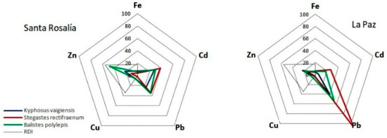 The muscle is an edible part of marine organisms that is commonly consumed by man; its consumption can be nutritionally important as fish contain unique long-chain polyunsaturated fatty acids (LC-PUFAs) and highly bioavailable essential micronutrients—vitamins (B and D) and minerals such as calcium, phosphorus, iodine, zinc, iron, and selenium [83]. However, it can also be hazardous if metal content in muscle is higher to the concentration required for human physiology. K. vaigiensis and B. polylepis are species of commercial importance for human consumption, while S. rectifraenum is an aquarium fish [15]. Cadmium concentrations in the fish species studied here were above the food safety thresholds established by the European Commission regulation for Cd in fish, i.e., 0.05 μg g−1 wet weight (0.25 μg g−1 dry weight [69]). Lead levels in S rectifraenum from STR were above the Codex alimentarius threshold of 0.3 μg g−1 wet weight (1.5 μg g−1 dry weight [69]) for Pb in fish [84]. The ingestion rate is the main factor that influences health risk associated with a specific food [85]. In the present study, a daily consumption of 30 g (210 g weekly) of K. vaigiensis or B. polylepis does not represent a health risk for human, in contrast, S. rectifraenum could be dangerous if consumed. The fishing site is a key factor. For example, the concentration of lead in S. rectifraenum collected in SRL and reported for other sites within the Gulf of California [54,71,76] is significantly lower than what we found in La Paz. Lead is an element that is causing a raising concern, as a dietary intake in adults of 1.50 μg/kg b.w. per day and 0.63 μg/kg b.w. per day produce cardiovascular and kidney affections, respectively [3].