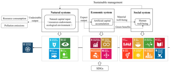 The concept of “health” was originally used to describe the human body and other animals and plants in a sound physical state [25,26]. The WHO defines health as not only the absence of disease or infirmity, but also the complete physical, psychological, and social state of well-being. On the basis of the relationship between ecosystems and humans, the health definition can be extended to ecosystems. Ecosystem health can be understood as the stability of the capital stock and the sustainability of the capacity to provide ecosystem services from the perspective of the structural function of the ecosystem and its mutually beneficial relationship with humans. Sustainable development is dedicated to searching for the reasonable self-reliance of the socio-economic–natural development system in terms of “development, coordination, and sustainability.” From the ecological aspect, we pursue a reasonable balance between ecosystem health and socio-economic development. The core of sustainable development-oriented ecosystem health addresses the relationship between humans and nature to ensure a balance between society’s demands on and returns to nature; that is, the increase in artificial capital does not presuppose the destruction of and reduction in natural capital. As a source of human welfare, natural ecosystems play an important role in improving the lives of human beings by providing them with the means of production and living; ecological resources are transformed into economic and material wealth to realize the accumulation of artificial capital, which is then invested in social development and regional construction. Natural ecosystems are also the material carriers of human life, providing direct ecological services, such as fresh air, clean water, and good environmental quality [27]. In addition to these desired outputs, the process of transforming natural capital into materials for human consumption has undesirable outputs, such as environmental pollution, with negative impacts on ecosystem health. To ensure the sustainability of ecological services and provide the basic guarantee of natural capital for humans, ecosystems must be managed sustainably.