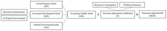 From the perspective of the natural–social–economic composite ecosystem, the need to coordinate natural and artificial capital under ecological scarcity is considered in this paper. An evaluation index system of the EHI for benchmarking SDGs was established, including three subindexes and a pressure adjustment coefficient (P), as shown in Figure 2 and Table 1.