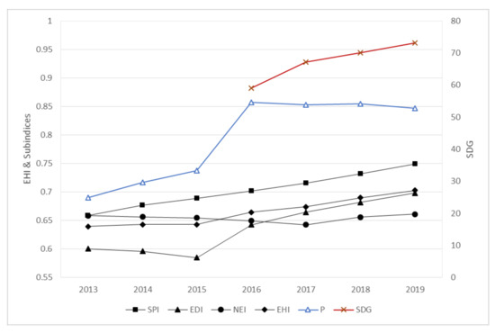 In this study, an EHI system was developed for Chinese provincial units based on the SDGs, consisting of the SPI, the EDI, the NEI, and P. Then, we studied the spatial and temporal variation in the EHI in 30 of China’s provinces from 2013 to 2019. The 30 provinces were classified into four basic types based on the three subindexes using a three-dimensional judgment matrix. The main findings are as follows: