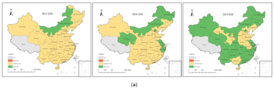 The characteristics of the spatial pattern were analyzed at three different points in time (i.e., 2013, 2016, and 2019). China can be divided into three major regions: eastern, central, and western. The eastern region includes the 13 provinces (cities) of Heilongjiang, Jilin, Liaoning, Beijing, Hebei, Tianjin, Fujian, Jiangsu, Shandong, Shanghai, Zhejiang, Guangdong, and Hainan; the central region includes the 6 provinces (cities) of Shanxi, Anhui, Jiangxi, Henan, Hubei, and Hunan, and the western region includes the 12 provinces (cities) of Inner Mongolia, Guangxi, Gansu, Ningxia, Qinghai, Shaanxi, Xinjiang, Guizhou, Sichuan, Tibet, Yunnan, and Chongqing. The EHI has a degree of spatial aggregation (Table 4, Figure 4a). In 2013, provinces with high EHIs were concentrated in the western region, followed by those in the eastern provinces, and the central provinces, such as Anhui, Henan, and Shanxi, had poor EHIs. However, through the implementation of the strategy of the rise of Central China, the ecosystem health improved with the commodity food base, important energy sources, and raw material base. By 2019, 19 provinces had transitioned to a healthy state, and the differences between regions gradually narrowed.