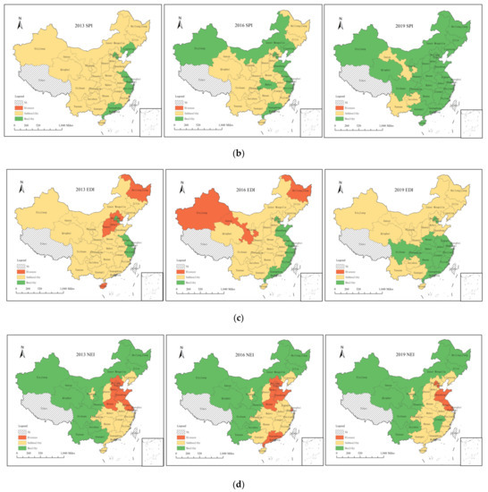The EDI (Figure 4c) of the provinces fluctuated considerably. The EDIs of Beijing, Tianjin, Jiangsu, and Zhejiang were at healthy levels in 2013, with a good economic foundation. In contrast, the EDIs of Hebei, Shanxi, Heilongjiang, and Hainan were at the disease level, with relatively low economic development. In 2016, Xinjiang and Gansu, which are located in northwest China, transitioned to a disease state. The terrains of these two provinces are mostly mountains and basins, and the transportation was underdeveloped. Their economic development was relatively low as it was mostly based on agriculture and animal husbandry. The southeast coast transitioned to a healthy state during this period and drove the economic development of the surrounding provinces. Provinces in a good economic state in 2019 are clustered around Beijing and Hubei. Owing to the focus of the western development strategy, the economic situation in the northwest also improved, with no provinces having an EDI in the disease category.