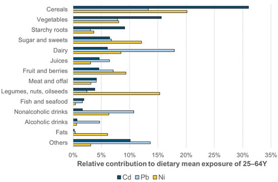 Figure 1 presents the relative contributions of different food groups to cadmium, lead and nickel exposure of 25- to 64-year-old Finnish consumers, and