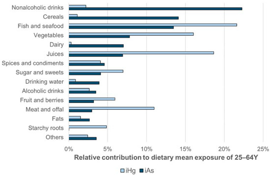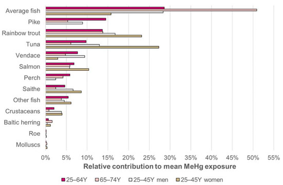 13]: in fish, out of the total Hg, 20% is iHg and 100% is MeHg; in crustaceans and molluscs, out of the total Hg, 50% is iHg and 80% is MeHg; in foods other than fish and seafood, all mercury is iHg. The relative contributions are based on literature cited in [