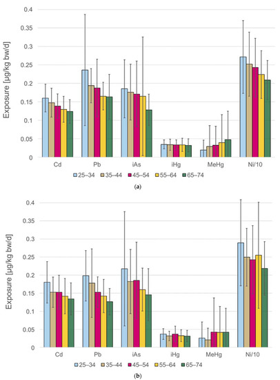 23]. The aim of using two food consumption datasets was to compare the heavy metal exposure levels and sources of the exposure between the two years, considering that with the use of the same occurrence data, all exposure differences are caused by changes in consumption habits. The differences in heavy metal intake by gender and age were also studied. The heavy metal exposure of women of fertile age (in this dataset considered to be 25 to 45 years) was compared against the other age groups and men of the same age.