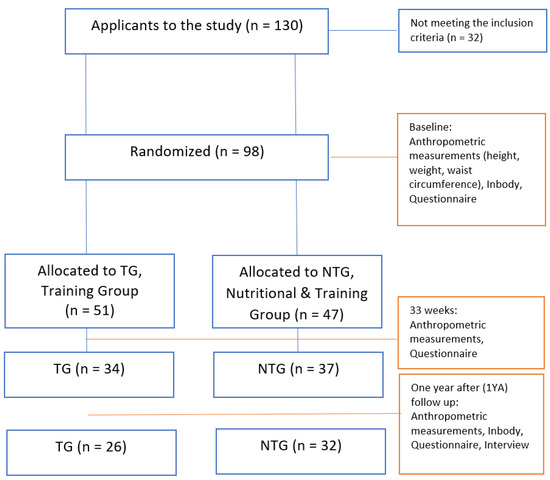 Research Randomizer (Research Randomizer Version 4.0; www.randomizer.org, accessed on 1 October 2016) was used to allocate participants into two groups. Research Randomizer is a free resource to generate random numbers or assign participants to experimental conditions. Participants in the same household (married/cohabitants) were randomized as one, to minimize the external influence of each other’s diet. One group received nutritional guidance (Nutritional Training Group = NTG); and the other group was instructed to eat as they did before entering the project (TG = Training Group). All participants, independent of group, followed a training program with two weekly, supervised training sessions at 4.30 p.m. Monday and Thursday, consisting of 10 min of warm up, 30 min of high-intensive interval running/walking depending on physical capacity, and 10 min of general strength training. In addition, participants were to take two weekly alternative training sessions with a moderate intensity of minimum 30 min each. Activity and duration were reported in training diaries and followed up regularly throughout the intervention period. In addition to training, the NTG also received nutritional guidance (10 × 2 h) and practical cooking lessons (8 × 3 h). To minimize absence, the cooking lessons were duplicated. Participants did not follow any defined, low-calorie diet, but received general nutritional guidance regarding which food to buy and the size and composition of meals to reduce their daily calorie intake. Participants were advised to follow 11 dietary guidelines published by the Norwegian Directorate of Health [29]: (1) enjoy a varied diet with lots of vegetables, fruit and berries, wholegrain foods, and fish, as well as limited amounts of processed meat, red meat, salt, and sugar; (2) maintain a good balance between the amount of energy obtained through food and drink and the amount of energy expended through physical activity; (3) eat at least five portions of vegetables, fruit, and berries every day; (4) eat wholegrain foods every day; (5) eat fish two to three times a week, also as a spread on bread; (6) choose lean meat and lean meat products, and limit the amount of processed meat and red meat; (7) include low-fat dairy foods in your daily diet; (8) choose edible oils, liquid margarine, and soft margarine spreads instead of hard margarines and butter; (9) choose foods that are low in salt and limit the use of salt when preparing food and at the table; (10) avoid food and drink that are high in sugar; and (11) choose water as a thirst quencher. In addition to these 11 guidelines related to diet, there is also one guideline on recommendations for physical activity. These guidelines are recommended for all healthy individuals, independent of size and weight. TG participants were requested to maintain their normal diet during the 33-week intervention period and were offered nutritional lessons and practical cooking lessons after this period.