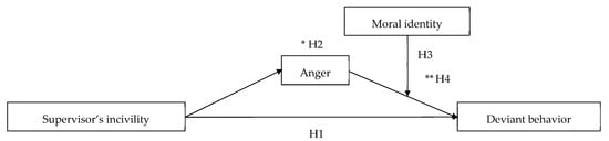 In contrast, employees with low moral identity have relatively weak standards and values regarding whether deviant behavior, a means of retaliation due to anger, is morally wrong. They have a strong motivation to find an appropriate way to respond and retaliate against the anger caused by their supervisor’s incivility but lack a control mechanism to consider it from a moral point of view. Therefore, for employees with low moral identity, the positive relationship between anger and deviant behavior is considered relatively strong. Prior studies have provided evidence of the moderating and main effects of moral identity. For example, employees’ deviant behavior resulting from abusive supervision has been demonstrated to be stronger for employees with low moral identity []. It has also been confirmed that the relationship between injustice, counterproductive work behavior [], and retaliatory behavior [] depends on employees’ moral identity. Therefore, we propose the following hypothesis: