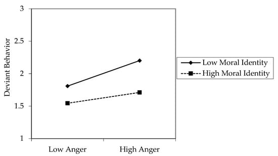 In Hypothesis 3, we proposed that moral identity moderates the relationship between anger and deviant behavior. As shown in Table 4, the interaction term of anger and moral identity significantly predicted deviant behavior (β = −0.16, p < 0.01; Model 4). In Figure 2, a graph distinguishes high and low moral identity groups in terms of the average value of moral identity []. As shown in Figure 2, when moral identity is low, the positive relationship between anger and deviant behavior is stronger. Thus, Hypothesis 3 was supported.