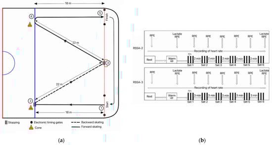 Study protocol. (a) Diagrammatic presentation of the direction and distance of skating in the repeated sprint skating ability test. (b) Schematic representation of the study protocol. This shows six sets of repeated sprint skating ability tests with two different passive rest period durations. (1) RSSA-2: Rest period of 2 min and (2) RSSA-3: Rest period of 3 min. Down arrows indicate time for collection of blood samples and recording of RPE. Heart rate was recorded continuously from rest until the end of the RSSA test.