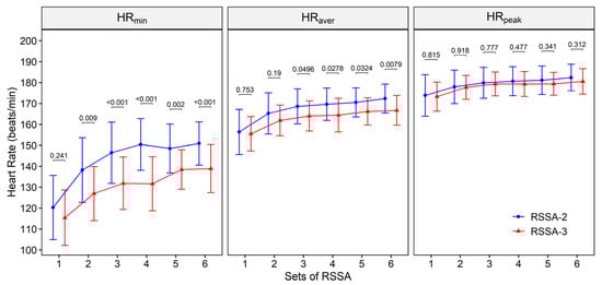 Heart rate response during RSSA-2 and RSSA-3 tests. P values between corresponding sets of RSSA-2 and RSSA-3 have been indicated above upper bars of 95% CI.