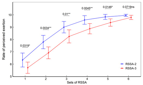 Rate of perceived exertion in RSSA-2 and RSSA-3 tests (** p < 0.01; *p < 0.05, ns—non-significant).