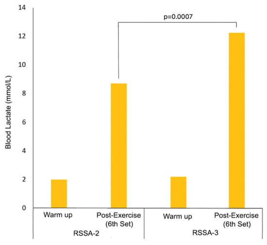 The [BLa] after warm-up and 3 min following the completion of the last set of both RSSA-2 and RSSA-3 tests are presented in Figure 6. Higher [BLa] after RSSA-3 (12.27 ± 2.75 mmol/L) was noticed in comparison to RSSA-2 (8.72 ± 2.59 mmol/L). No significant difference between warm up [BLa] before RSSA-2 (1.98 ± 0.68 mmol/L) and RSSA-3 (2.31 ± 1.01 mmol/L) was found.