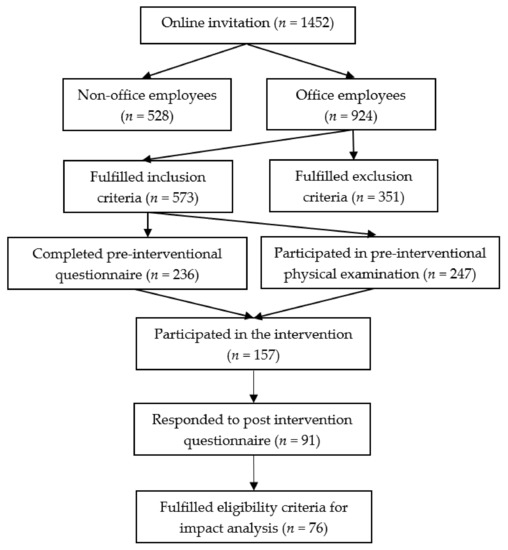 An interventional cohort study was conducted among sedentary employees of the Hungarian subsidiary of the National Instruments Corporation (Austin, Texas, USA) in Debrecen at NI Hungary Ltd. Pre-intervention examinations were performed between the 9th of November and the 7th of December 2018. The intervention was implemented in the company’s fitness center between the 28th of January and 14th of June 2019. Post-intervention tests were conducted between the 17th and 28th of June. From a total of 1452 employees, those workers who had experienced lumbar complaints in the previous year and who had sedentary occupations were invited to participate in the physical examinations and in a 20-week long Multimodal Progressive Functional–Proprioceptive Training Program specifically designed for employees in the workplace environment during their working hours. An online screening questionnaire for the collection of subjects and a motivation letter about the schedule and content of the physical examination and the “New Spine Program” were distributed via the electronic newsletter of the company in October. The invitation contained the inclusion and exclusion criteria (Table 1); information about the dates, venues and process for the physical examination; the content and schedule of the Training Program; and the method of registration for both the physiotherapeutic assessment and training sessions. Employees were asked to complete a pre-interventional questionnaire if they fulfilled the inclusion criteria and were willing and able to participate in both the physical examinations and the intervention itself (Figure 1).