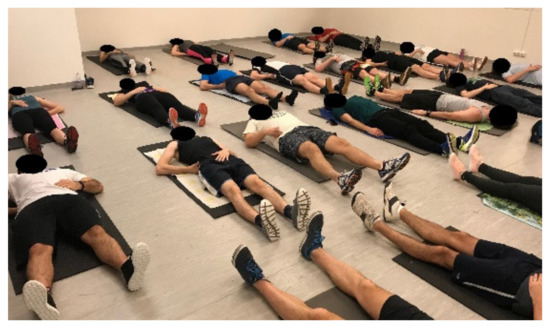 The goal of this phase was to teach and enable the practice of conscious, voluntary segmental lumbopelvic stabilization using the abdominal drawing-in maneuver (ADIM) [37]. The participants were asked to lie on the mat in a straight but relaxed position and search and feel for the proper neutral position of the pelvis and lumbar spine. Verbal explanations helped in the required positioning, and the subjects had been taught to manually palpate and control the anterior superior iliac spine (SIAS) and symphysis pubis in line with the horizontal plane. After correct positioning, the subject was taught—following Saliba et al. [38]—to contract the deep core musculature, focusing on the multifidus, abdominal transverse, and pelvic floor muscles, without the contraction of superficial muscles or any movement of the pelvis and spine. The verification of proper contraction was carried out by both the physiotherapist and the subject. Supine bridging was performed with a slow hip extension by raising the pelvis and the trunk in a block by hip extension until reaching the trunk and femur in line (Figure 3).