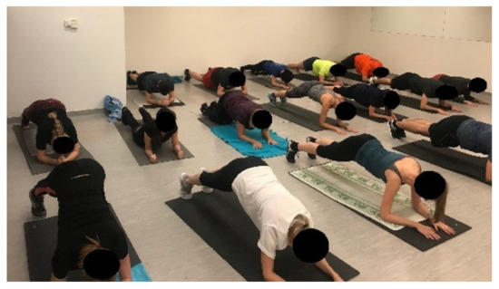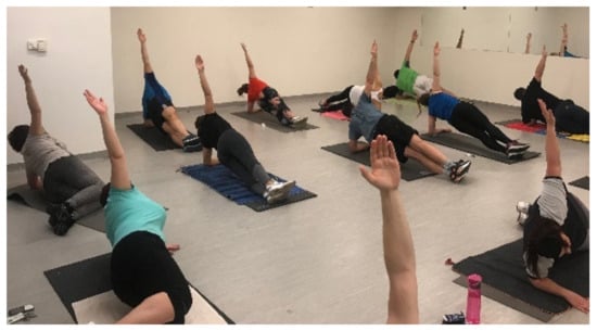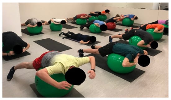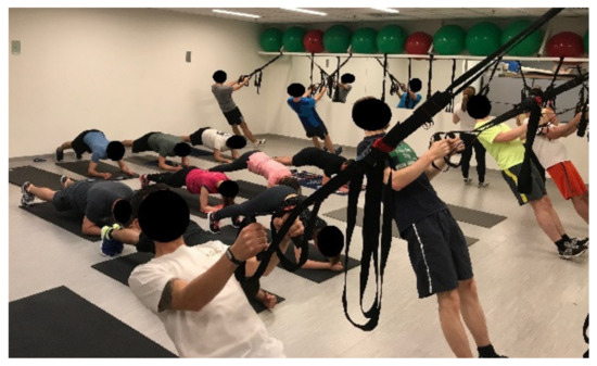 During the phase of Functional Training, the group was divided into two subgroups, and circuit training was performed. One subgroup performed exercises chosen from the previous phases of the TP; the other subgroup used a Suspension Trainer (ST) (TRX, Fitness Anywhere LLC, San Francisco, CA, USA) in order to perform unstable, multi-planar, functional exercises (Figure 9). As described above, in this section, 4 sets of different exercises were performed with 4 repetitions of each exercise. One repetition of an exercise lasted for 45 s, followed by 15 s of recovery, and a 1 min recovery time was allowed between the sets. None of the exercises were compulsory to complete; all the participants had the opportunity to ask for a given exercise to be changed to an easier or harder one. The exercises in this phase were chosen from those listed below, taking into account the principle of gradation, progression and individual subjective sensation of exhaustion or capability during the 12 weeks of functional training. Due to the factors listed above, the sequence and weekly progression of the exercises used in this phase cannot be generalized or defined precisely.