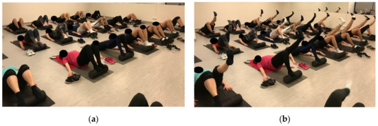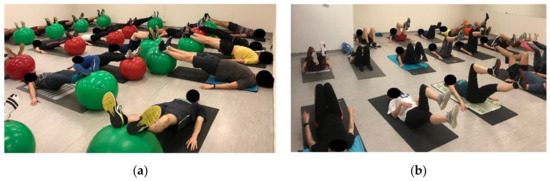 Focus was placed on an introduction to proprioceptive exercises by gradually decreasing the size of the supporting surface and switching from stable to unstable surfaces. In case of supine bridging, progression was determined according to the following: (1) bilateral stable bridging; (2) bilateral stable bridging with one-sided knee extension; (3) unilateral stable bridging; (4) bilateral unstable bridging; (5) bilateral unstable bridging with one-sided knee extension; (6) unilateral unstable bridging. Instability was created using a foam roller. An unstable supine plank was also used with bilateral prior to unilateral support. Instability was created using a Swiss ball (Figure 6a,b).