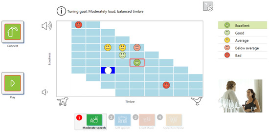 At the top of the interface, users are given instructions about the ideal sound setting, which is to be found by exploring the matrix of cells. At the bottom of the user interface the SFP provides four sound environments, which enable self-fitting with four different kinds of sound: moderate speech, soft speech, loud music, speech in noise. The green buttons on the left are intended for enabling the HA connection and to play the sound of the current sound environment.