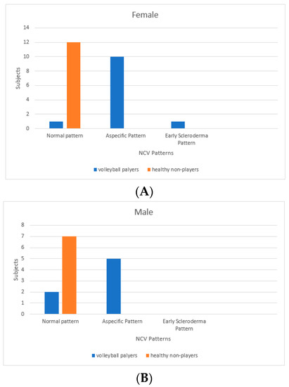 Although limitations related to sample scarcity and disparity between the populations under examination, the study documented significant capillaroscopic differences between volleyball players and healthy controls, both males and females. Training for long time was associated with a greater frequency of capillaroscopic alterations. Microvascular damage can be easily detected by NVC: capillaroscopic changes have been described in athletes [23,28], musicians [29,30], subjects exposed to radiation [31] however “non-specific pattern” (by qualitative assessment) and non-specific capillaroscopic abnormalities (by quantitative assessment) are even found in healthy subjects [25]. Athletes who are exposed to repetitive motion or high-speed collisions may have arterial or venous injuries [32,33]. In particular, volleyball players are often exposed to finger trauma due to the high use of the fingers tips during the game, reaching and hitting the ball.