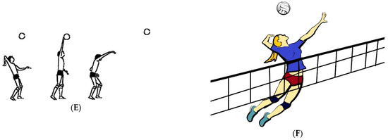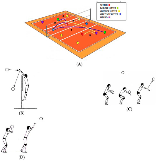 Volleyball is a team sport that takes place between two teams of six players per team. There are five positions: setter, outside hitter/left side hitter, middle hitter, opposite hitter/right side hitter and libero/defensive specialist, each with a specific key role in the volleyball match [34]. The liberos receive the ball with the bagher on close and supinated forearms to form a large and homogeneous surface. The action performed by the setter is the pass, carried out by bringing the hands over the head, so that the thumbs and index fingers form a figure similar to an inverted heart. The middle hitters mainly act with the block, a jump with arms stretched upwards and hands forming a plane of rejection of the ball towards the opponent’s field. The Opposite and Outside hitters have the task to attack with a blow carried out with concave hand, to give a rotating effect to the ball [32] (Figure 7).
