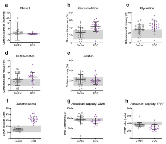 - Erasmus, E.; Steffens, F.E.; Van Reenen, M.; Vorster, B.C.; Reinecke, C.J. Biotransformation profiles from a cohort of chronic fatigue women in response to a hepatic detoxification challenge. PLoS ONE 2019, 14, e0216298. [Google Scholar] [CrossRef] [PubMed]