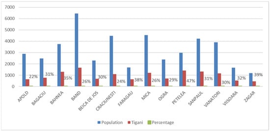 The second research step was to gather information from The Romanian Institute for Research on National Minorities who provided data on a number of the 1387 rural villages that have a Țigani community. The database is publicly available, offering information about rural Romania segregation and living standards []. With the Microsoft Power Bi analytics data visualization tools, we observed the errors of segregation index which relates to groups of small villages, administratively united in a commune. Therefore, we were able to correctly analyze the Romanian National censuses data [] which showed that numerous Țigani ethnics live in mixed Romanian-Hungarian villages in Mures, the county with the largest Țigani population in Romania. To understand why they were able to better adapt in mixed villages compared with ethnically homogeneous ones, we determined the villages with Țigani target groups based on the national censuses data analysis results. The selected rural villages have similar natural settings, socioeconomic level, and cultural characteristics. We structured them in categories based on egregor strength and ethnic admixture to show Țigani′s ability to fight poverty, their significant adaptability to the societal changes and their power to keep intact their cultural identity despite unfavorable odds. The first category included Hungarian communities with a weak egregor such as Neaua and Crăciunești, invaded by traditional Gabori. In the second category we analyzed the tight-knit Romanian/Hungarian villages with a strong egregor where the residents never sold land to traditional or modern Țigani families such as Hodac and Chibed. The third category is represented by the numerous villages with mixed Romanian-Hungarian population and many traditional Gabori and modern Rroma/Roma people such as Bagaciu, Bahnea, Band, Cristesti, Sanpaul, and Vanatori.