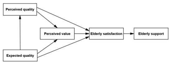 32] found that elderly people’s satisfaction with nursing services was strongly correlated with their intention to use such services and that the elderly consumed the services again if they were satisfied. In this article, elderly support is the intention of elderly individuals, and elderly individuals will continue to support nursing services if they are satisfied with such services. Based on the above analysis, the following hypothesis is proposed: