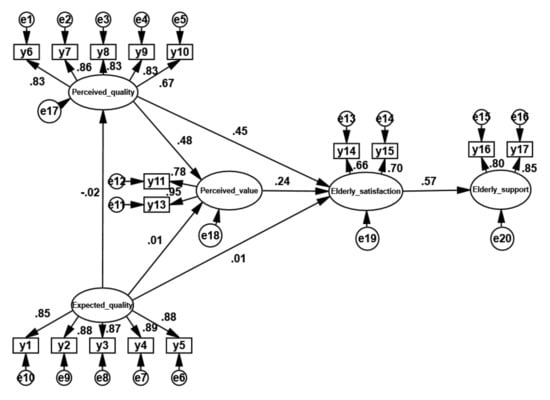 Elderly satisfaction and elderly support are the endogenous latent variables of this model, and expected quality, perceived quality and perceived value are its exogenous latent variables. Since the five latent variables, i.e., expected quality, perceived quality, perceived value, elderly satisfaction, and elderly support, cannot be directly observed, we set up 16 observed variables to measure them accordingly. Refer to
