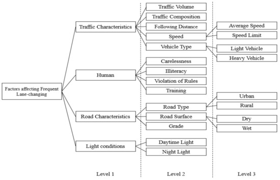 Step 1: The hierarchical structure of the factor influencing frequent lane-changing was constructed based on the literature and driving experts’ point of view (Figure 1). The hierarchical structure of the problem consists of four main factors located in level 1, 14 sub-factors located in the second level and gathered into four groups, and eight sub-factors located in the third level and gathered into four groups.